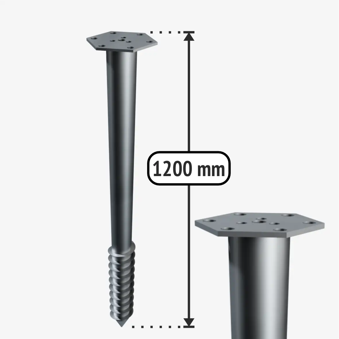 Šis ilgis tinka terasoms, nedideliems statiniams ir atramoms, kur nebūtina laikyti didelių apkrovų. Galima iki 20 cm palikti neįsuktą į gruntą. Taip išspręsite nelygaus reljefo situacijas. O ilgesnius ir didesnio diametro polius galite panaudoti nuo terasos iki pamatų namams įrengimo. M-tipo sraigtinio polio plokštelė skirta atremti montuojamam karkasui. Jei nepavyko sumontuoti sraigtinių pamatų vienoje tiesėje, nieko baisaus, nes plokštelė plati ir nebūtina, kad karkasas remtųsi tiesiai per vidurį. Taip pat plokštelėje yra vieta montuoti ilgasriegiui ir papildomos skylės, jei karkasas nepataiko per centrą. Ant sraigtinio polio plokštelės taip pat galite prisukti bet kokį Jums tinkantį laikiklį. Ilgasriegio pagalba galėsite karkasą sumontuoti milimetrų tikslumu. Didesniam kiekiui ar ilgesniam poliui reikės įrangos.